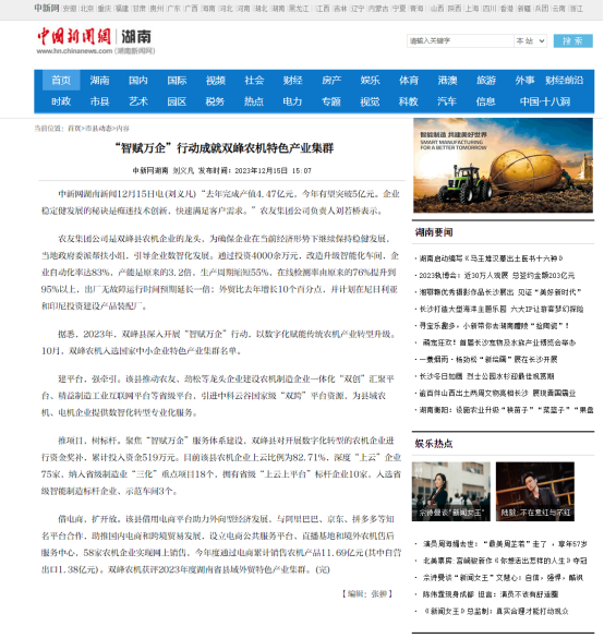 据悉,2023年,双峰县深人开展“智赋万企”行动,以数字化赋能传统农机产业转型升级10月,双峰农机人选国家中小企业特色产业集群名单